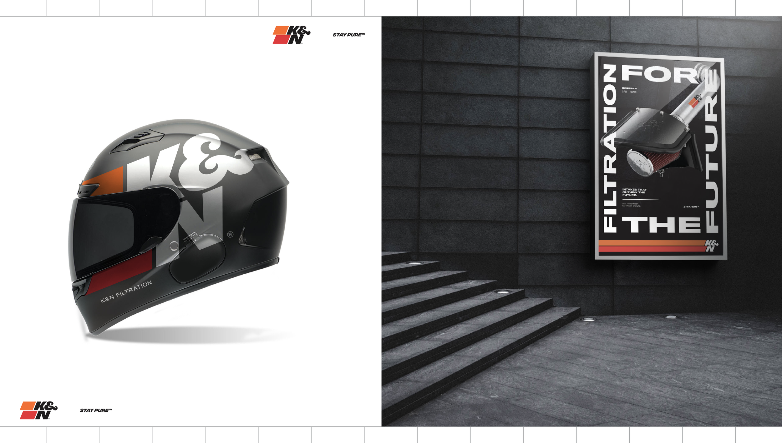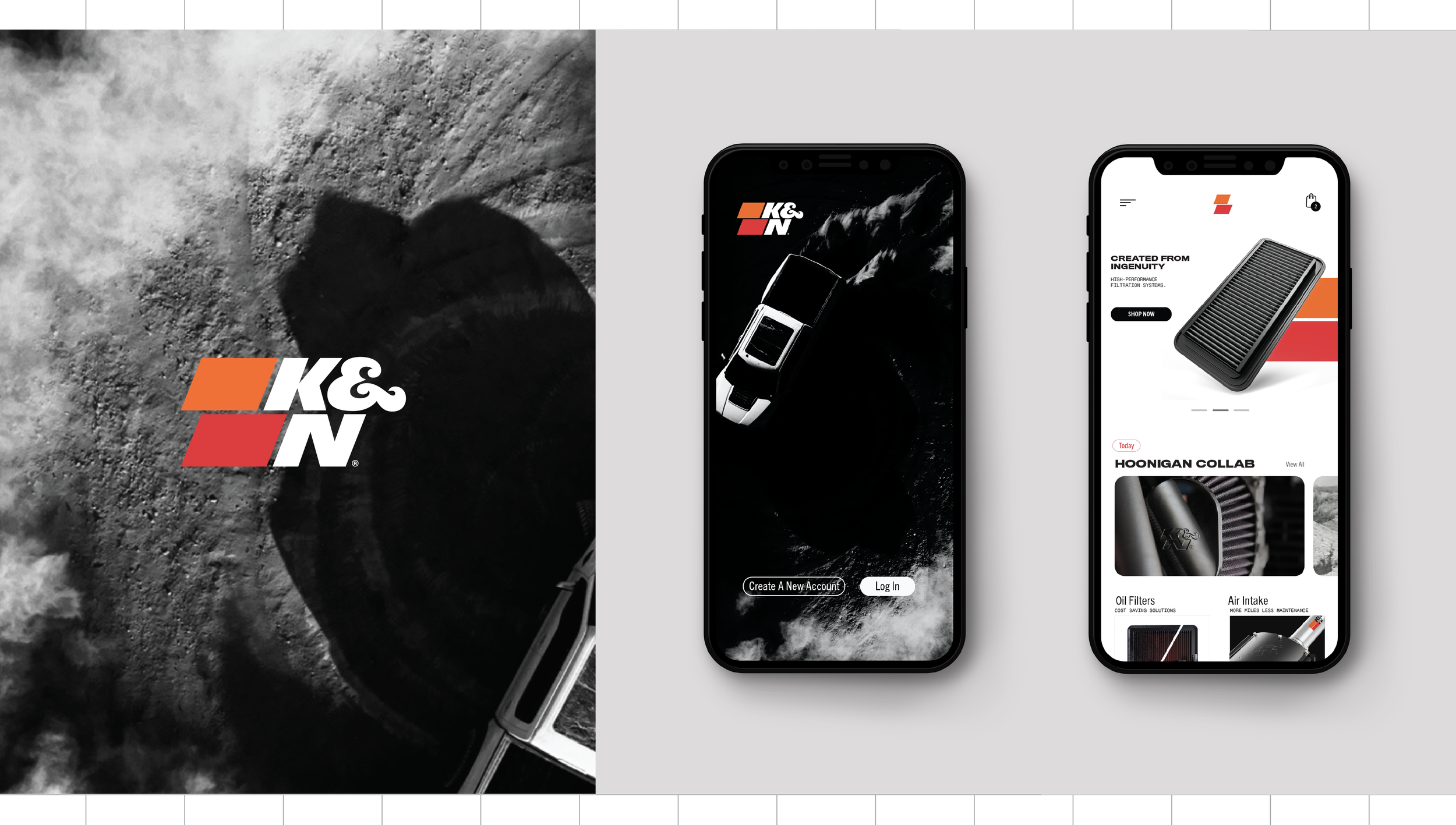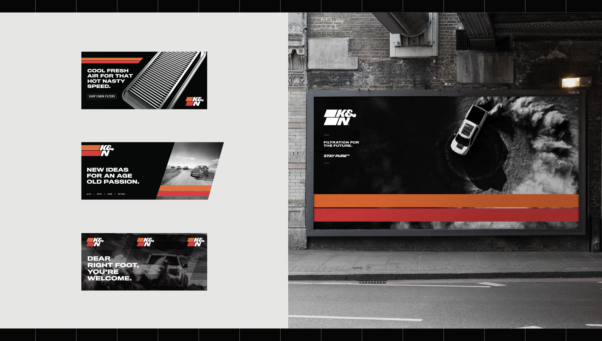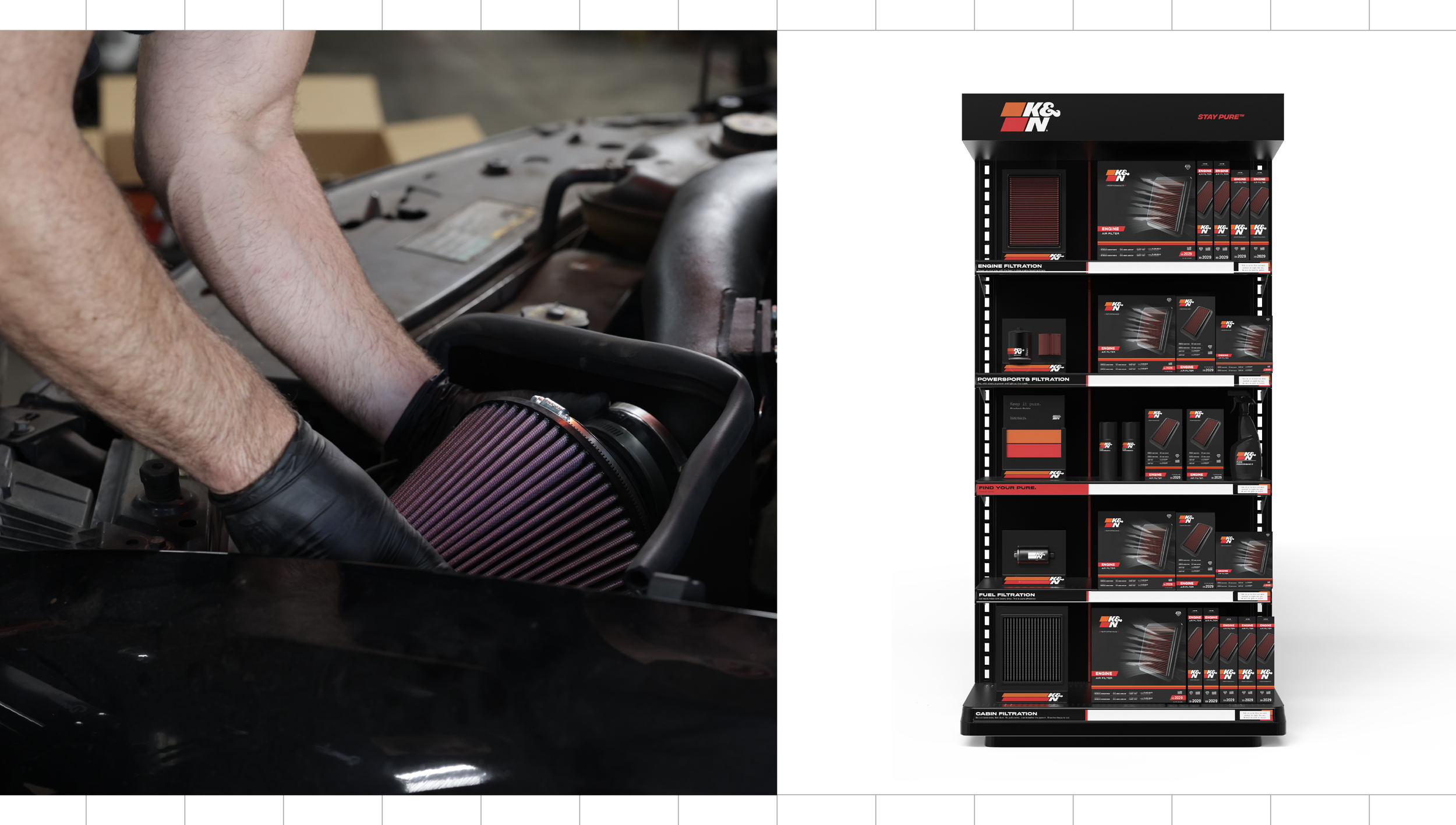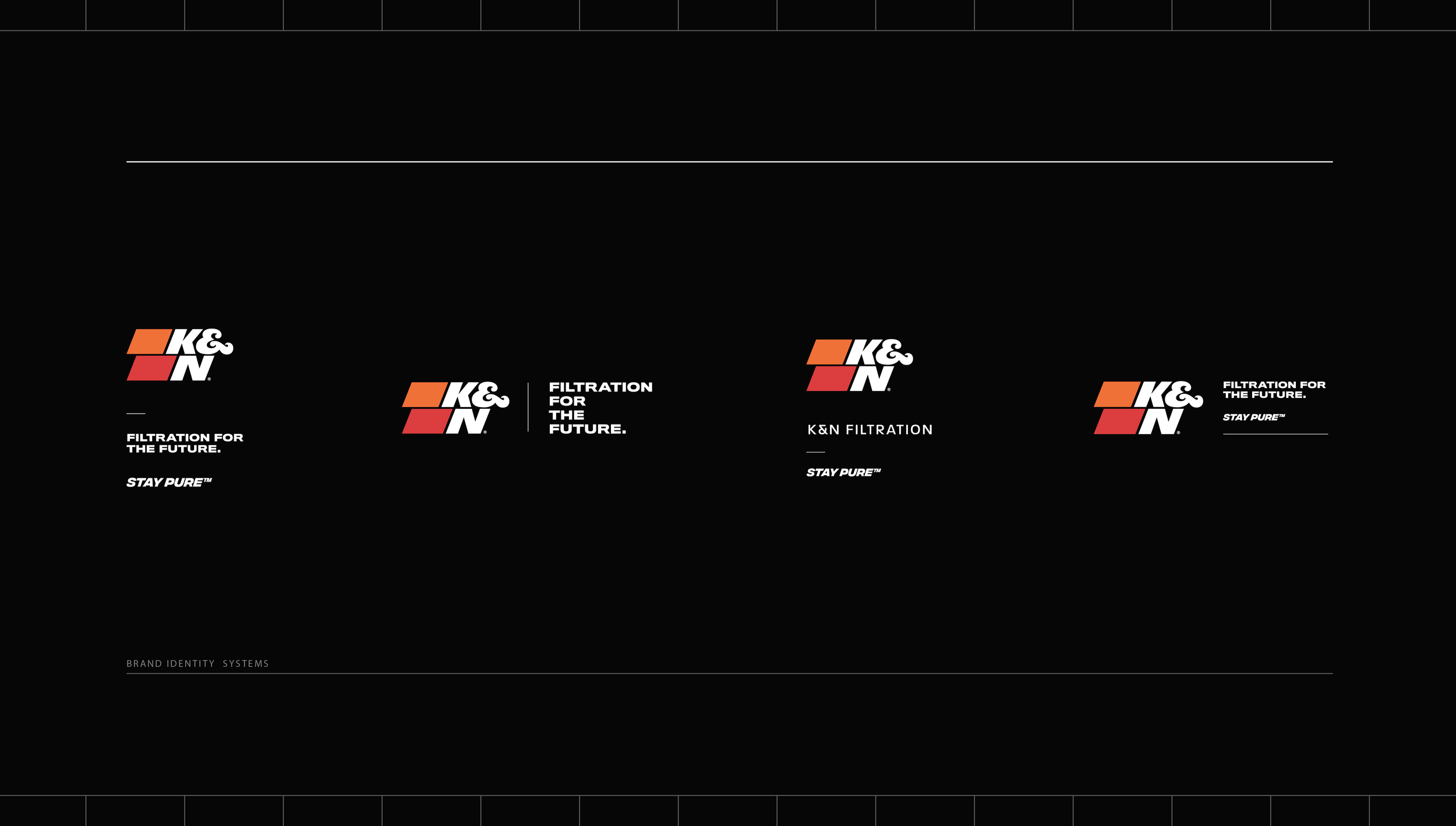 In 2019, in partnership with Soldier Unlimited, we reimagined K&N Filtration with a rebrand — logo design, site build, packaging edit and commercial spots refresh. We partnered with K&N for 4 years bringing filtration innovation systems to live in a new and expressive way that saw an increase in sales and love for the brand.
