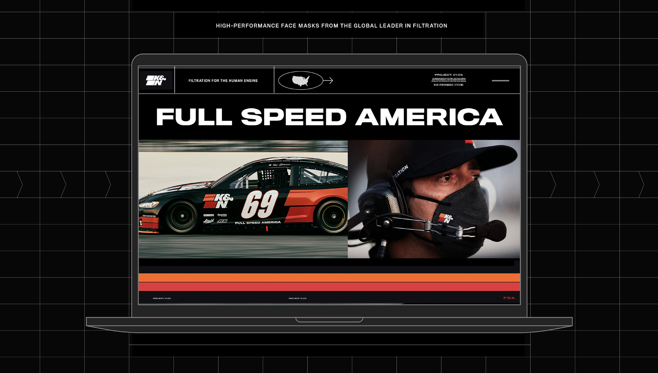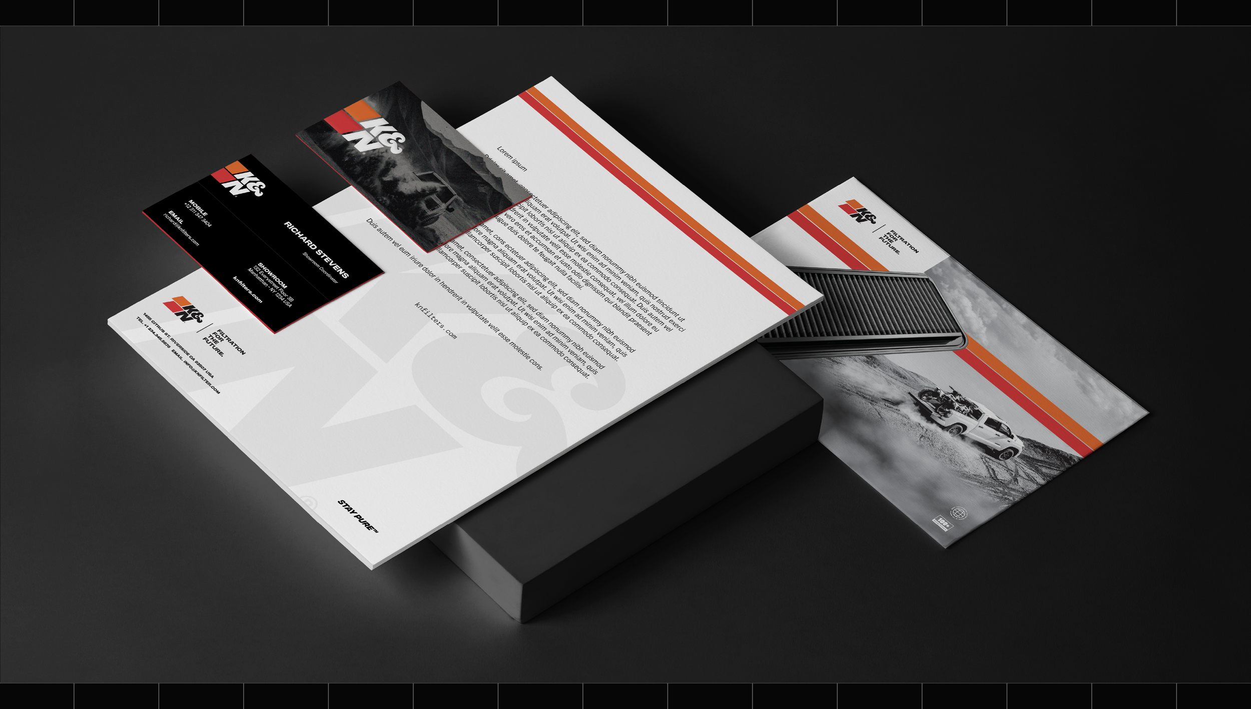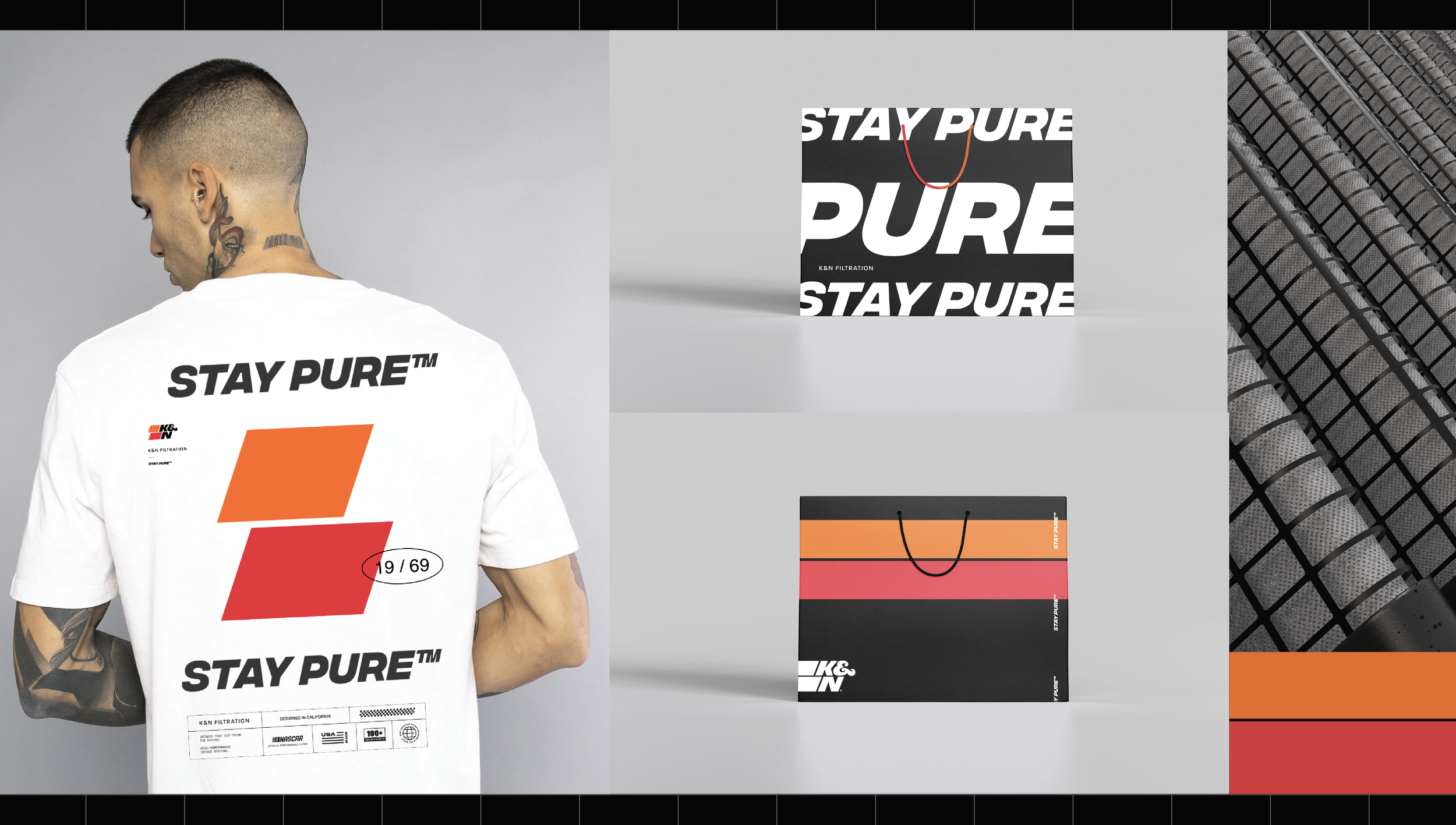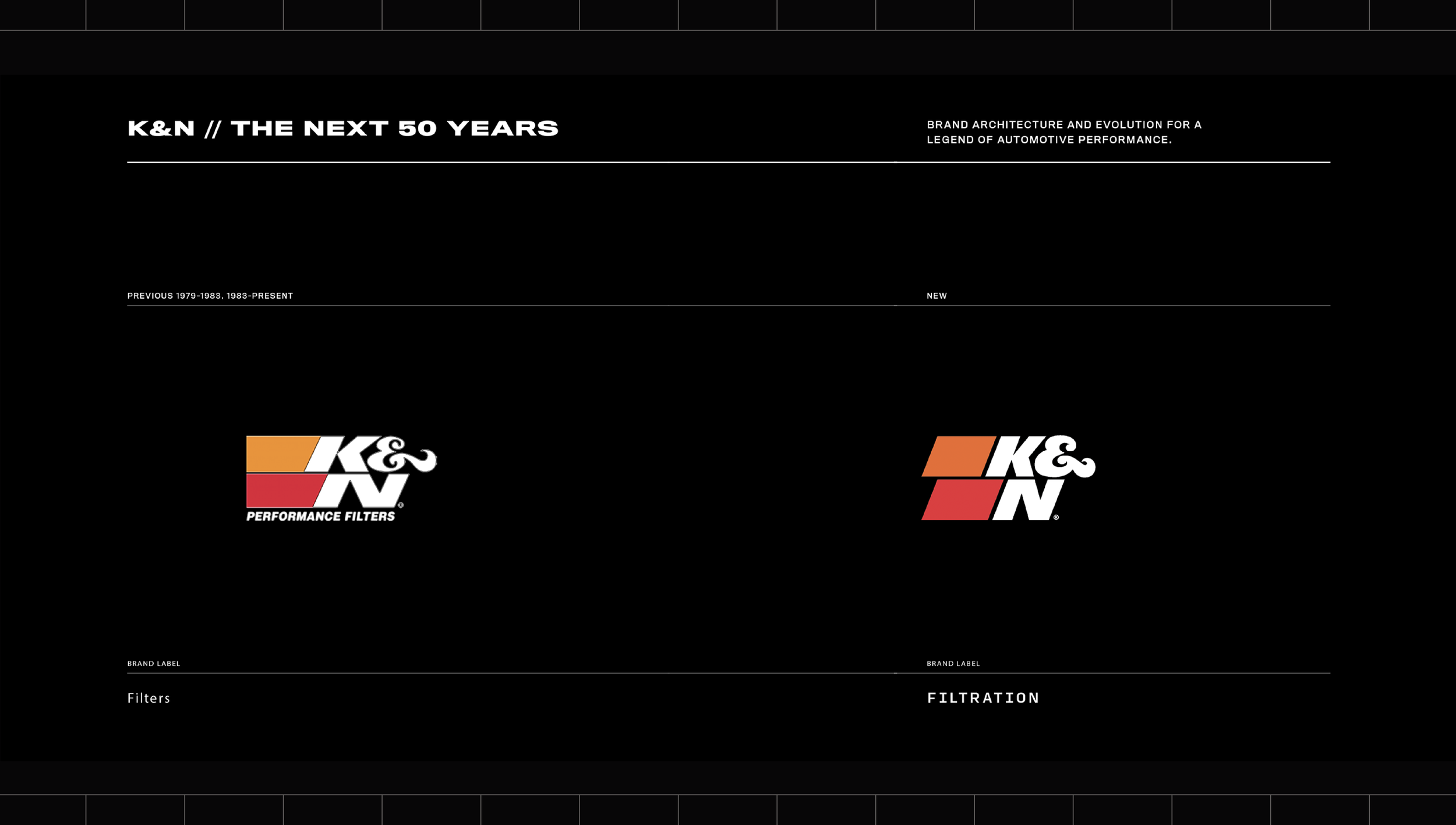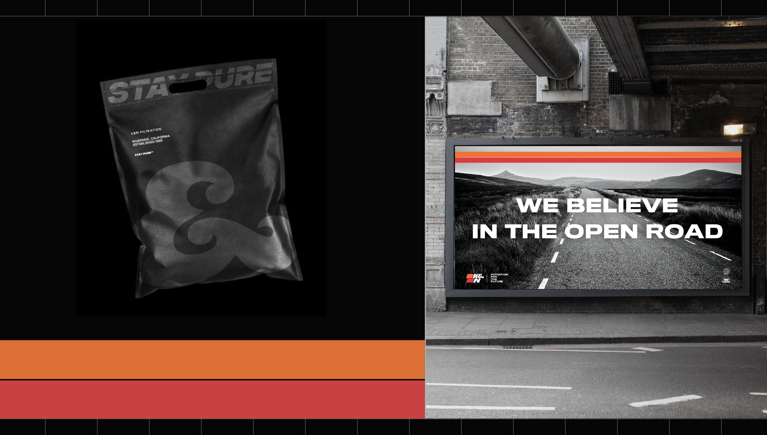 In 2019, in partnership with Soldier Unlimited, we reimagined K&N Filtration with a rebrand — logo design, site build, packaging edit and commercial spots refresh. We partnered with K&N for 4 years bringing filtration innovation systems to live in a new and expressive way that saw an increase in sales and love for the brand.